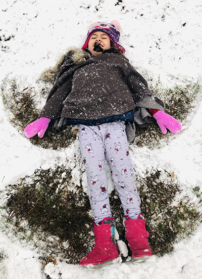 has moved on now to snow angels, the white covering thin enough for her