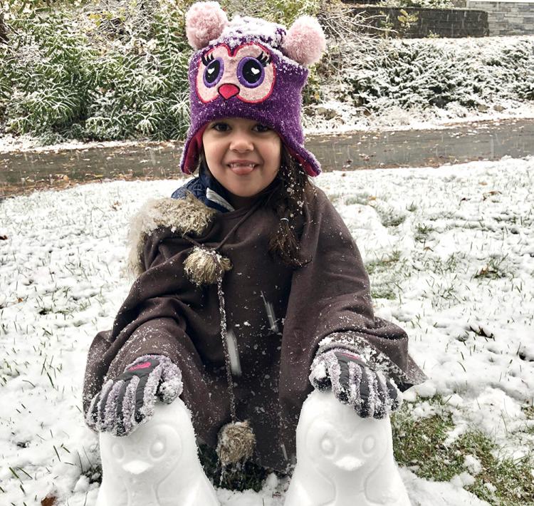 are building snow penguins. And as the flakes cover our heads and her